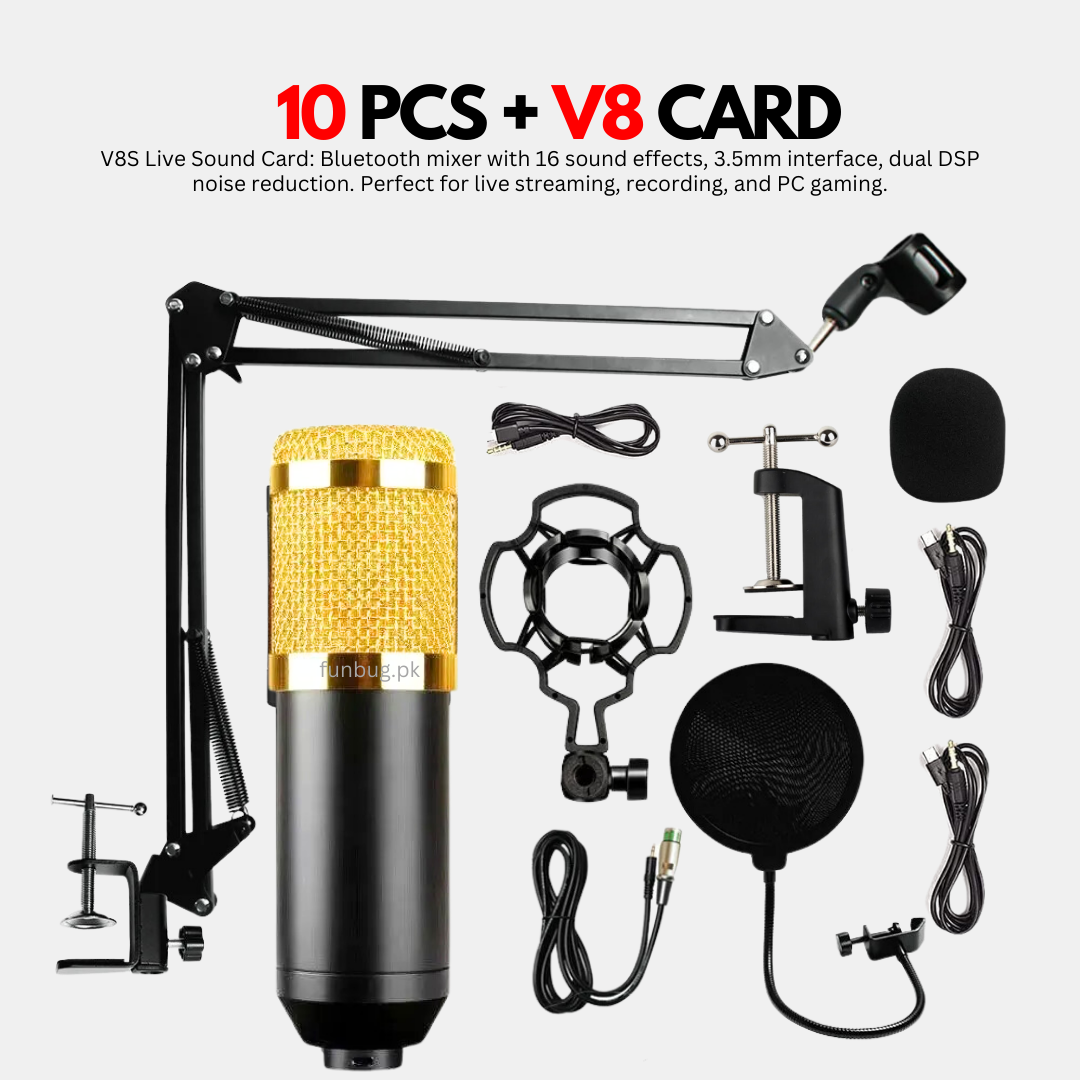 - Complete Podcast Kit: Includes a high-quality BM800 condenser microphone, V8 live sound card, shock mount, adjustable scissor arm stand, pop filter, foam cap, and power cable—everything you need in one set for podcasting, streaming, and more.